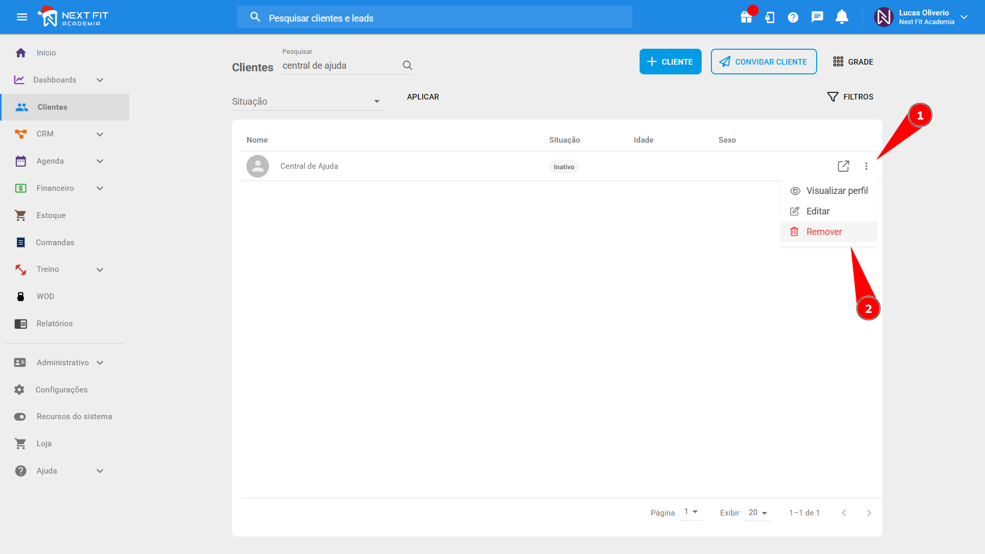 Pesquisando no módulo ClientesPesquise pelo Nome ou CPF do aluno na barra de pesquisa do módulo Clientes para encontrar o cliente desejado. Clique duas vezes no nome do cliente para acessar seu cadastro, ou utilize TRÊS PONTINHOS > VISUALIZAR PERFIL.