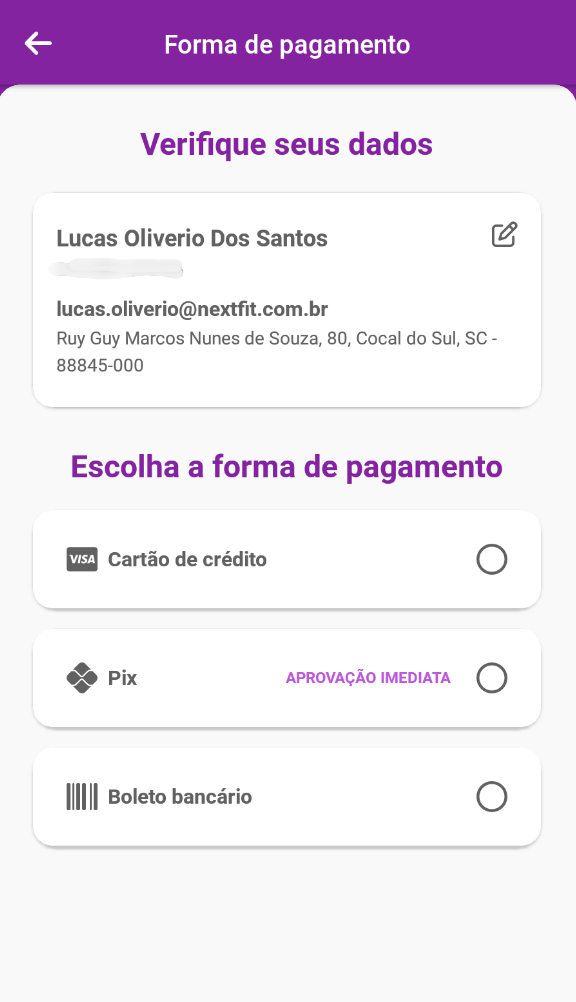 - Boleto: Será gerado um boleto que poderá ser baixado no mesmo momento no app, bem como um código para pagamento do boleto. Além disso, o boleto é também encaminhado para o e-mail do cliente.