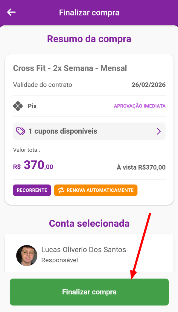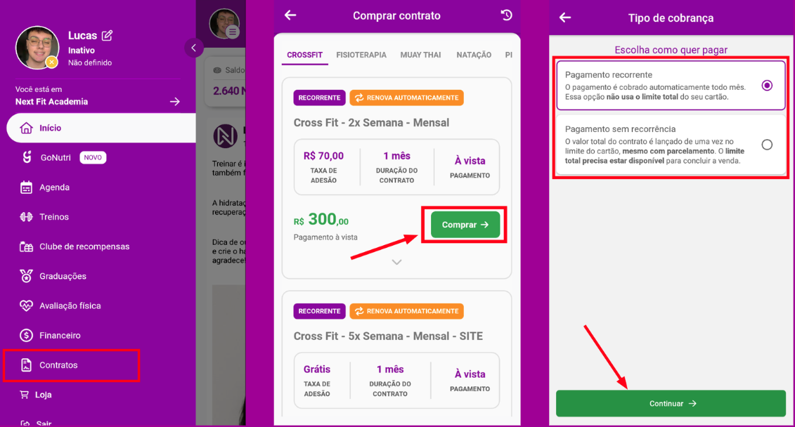 Comprando pelo aplicativo do alunoNo aplicativo do aluno, acesse a aba lateral e clique em Contratos > Selecione a modalidade > Escolha o contrato > COMPRAR. Caso o contrato permita tanto o Pagamento recorrente quanto o Pagamento sem recorrência, opte por uma das opções, confirmando em Continuar.