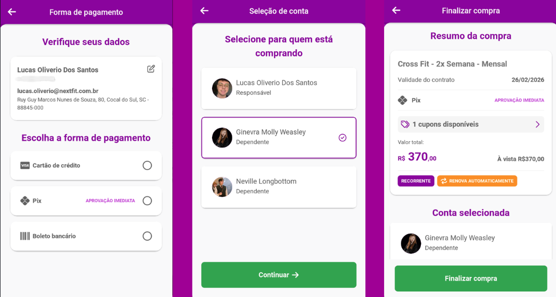 Comprando para um dependentePara realizar a compra para um dependente, o processo é parecido, porém, irá ter uma etapa a mais para selecionar o perfil que será realizado a compra.