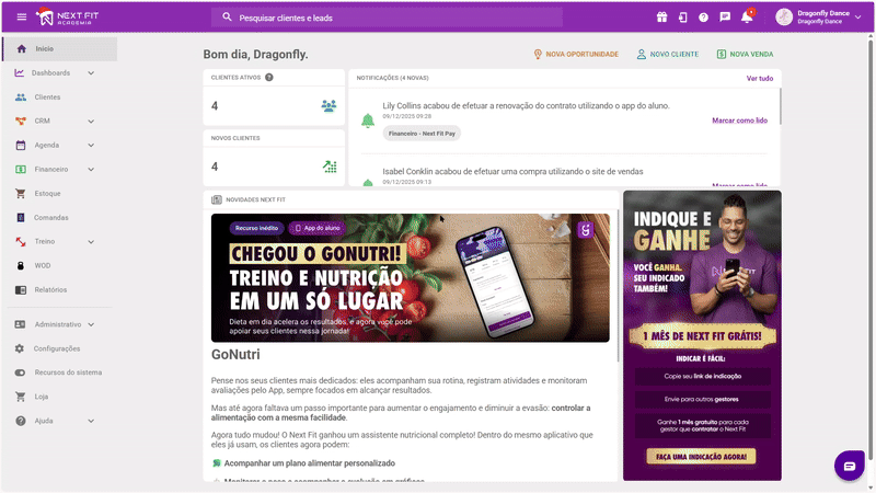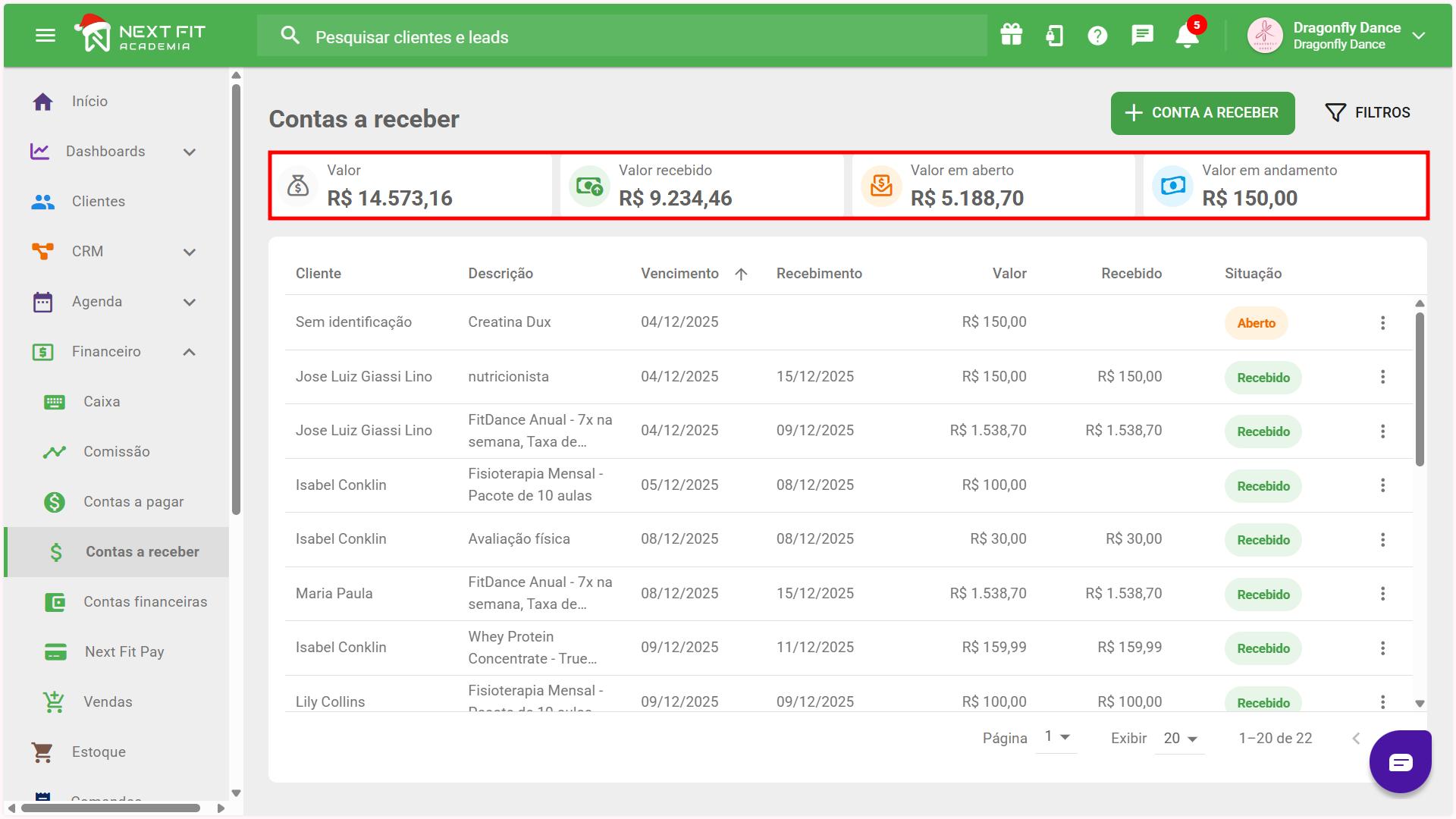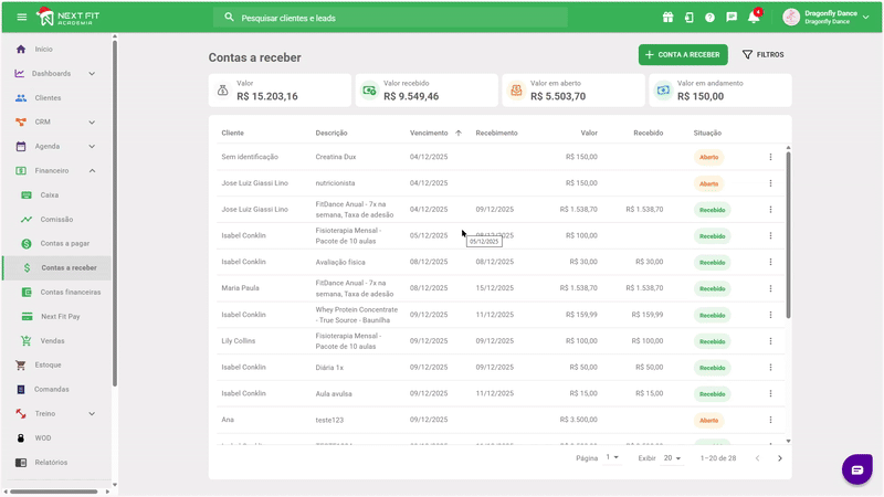 - Valor em andamento: a soma dos títulos financeiros com situação "Em andamento", conforme os critérios de filtro. É a quantia pendente de pagamento do meio do Next Fit Pay (recorrentes).