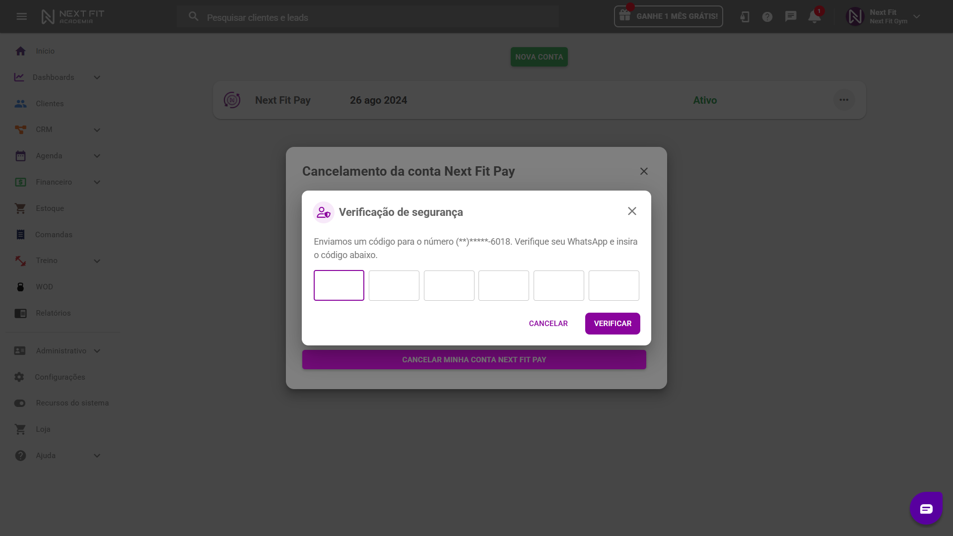 Após inserir o código no sistema, clique em VERIFICAR e a conta Next Fit Pay estará cancelada.
