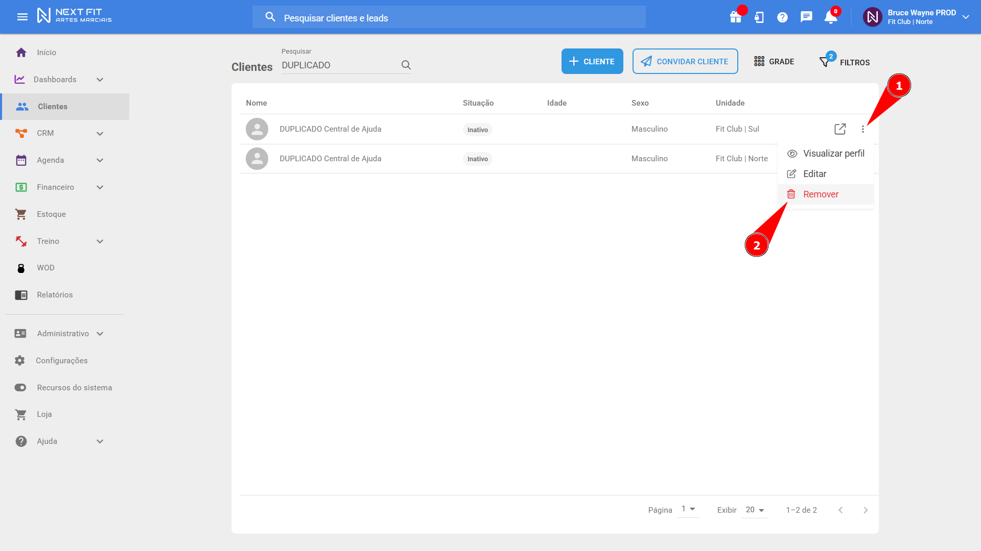 Para remover o cadastro duplicado, clique nos Três pontinhos, ao lado do nome do cliente, depois em Remover
