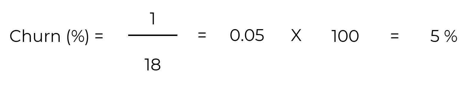 Como exemplo prático de cálculo, usaremos os números apresentados nas imagens acima, dessa forma, o total de clientes perdidos no período é de 1 e o total de clientes no início do período é igual a 18. Portanto, este é o Churn deste caso resultou em 5%: