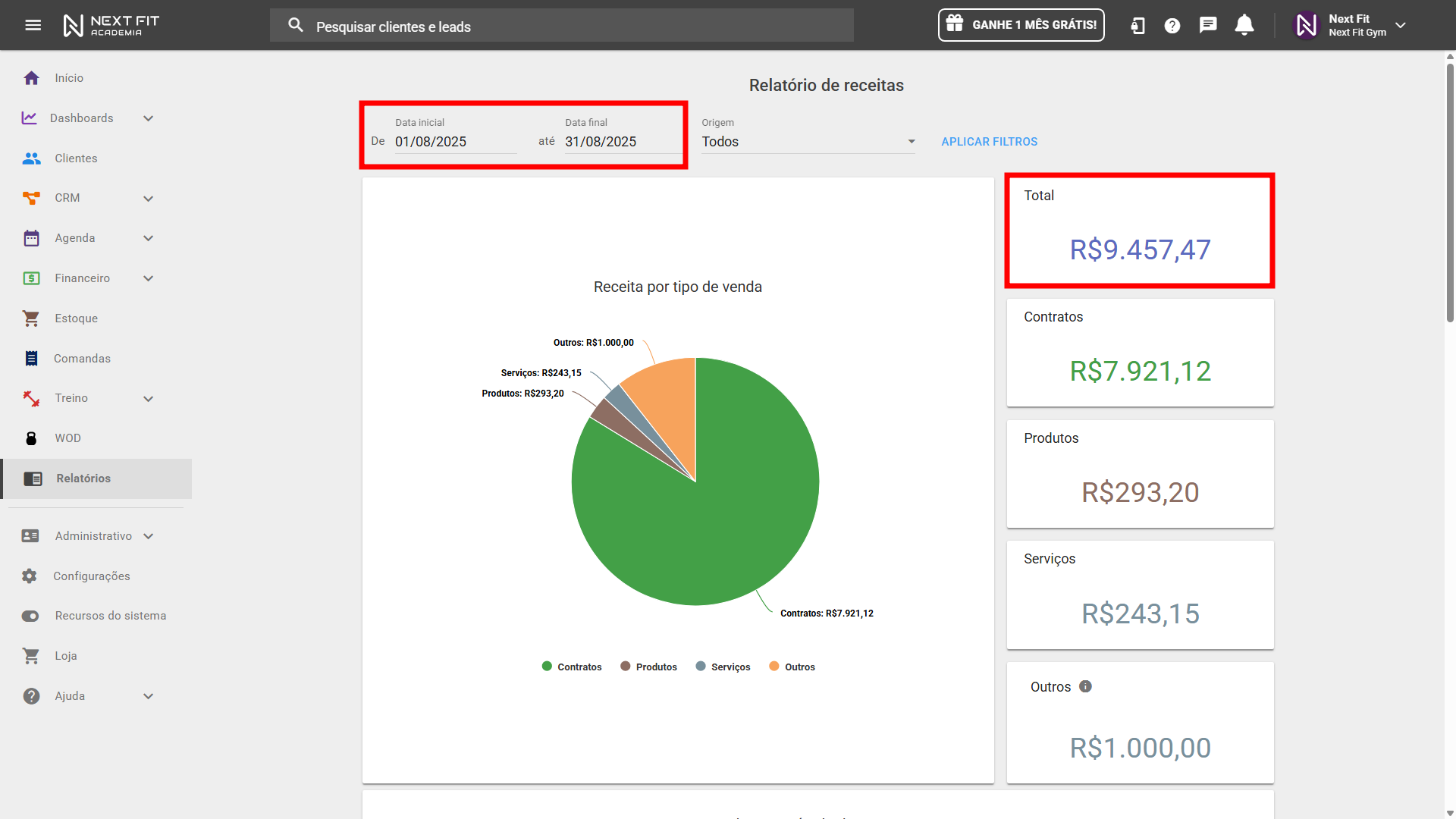 Após visualizar o relatório, filtre no mesmo período utilizado durante o cálculo do Churn e anote o valor total de receita no período, que será utilizado no cálculo de receita média por cliente.
