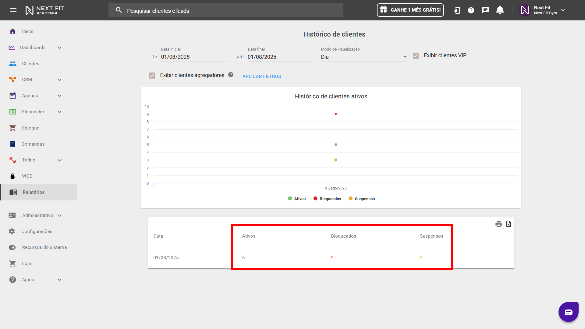 Para encontrar o total de clientes no início do período, acesse o módulo de Relatórios > Financeiro > Histórico de clientes ativos. Utilizando os filtros, determine a Data inicial e Data final, como a data início do passo anterior (Ex: primeiro dia do mês anterior).