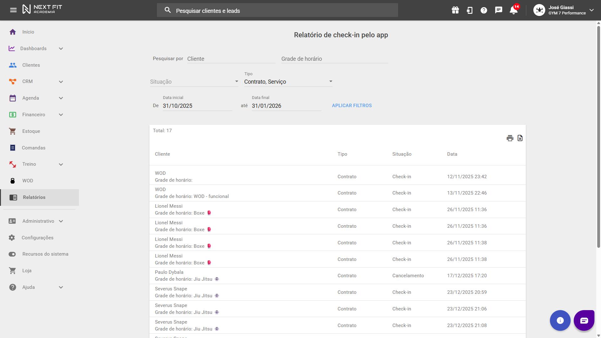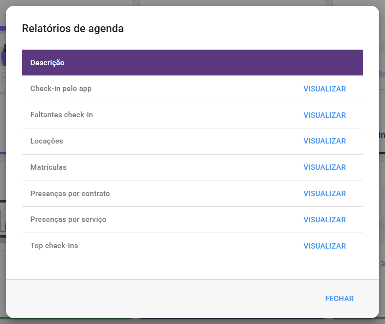 Os Relatórios de Agenda oferecem uma visão ampla sobre os check-ins pelo app, faltas, presenças, entre outras informações.
