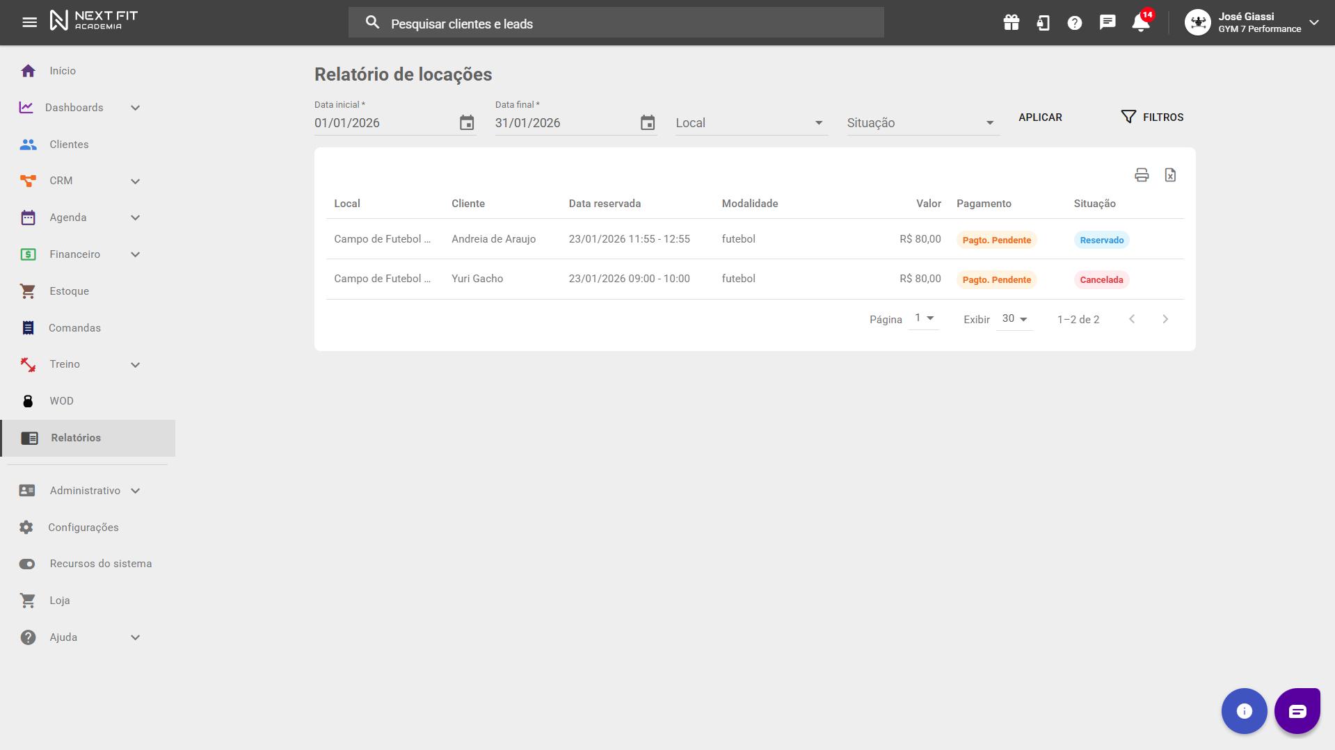 Para visualizar este relatório de Presenças por contrato, acesse Relatórios > Agenda > Locações.