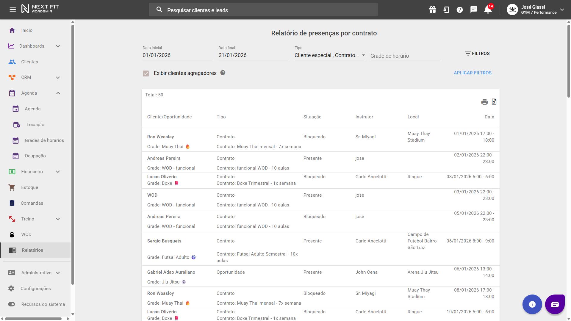 Relatório de Presenças por contrato: O relatório de “Presenças por Contrato”, pode lhe ajudar quando você deseja saber como está a presença na agenda de um cliente, de uma oportunidade, ou até mesmo de um cliente especial, em uma grade de contratos. Nele você pode selecionar o período que deseja visualizar, a grade de horário específica, e a situação, se levou presença ou falta, por exemplo.