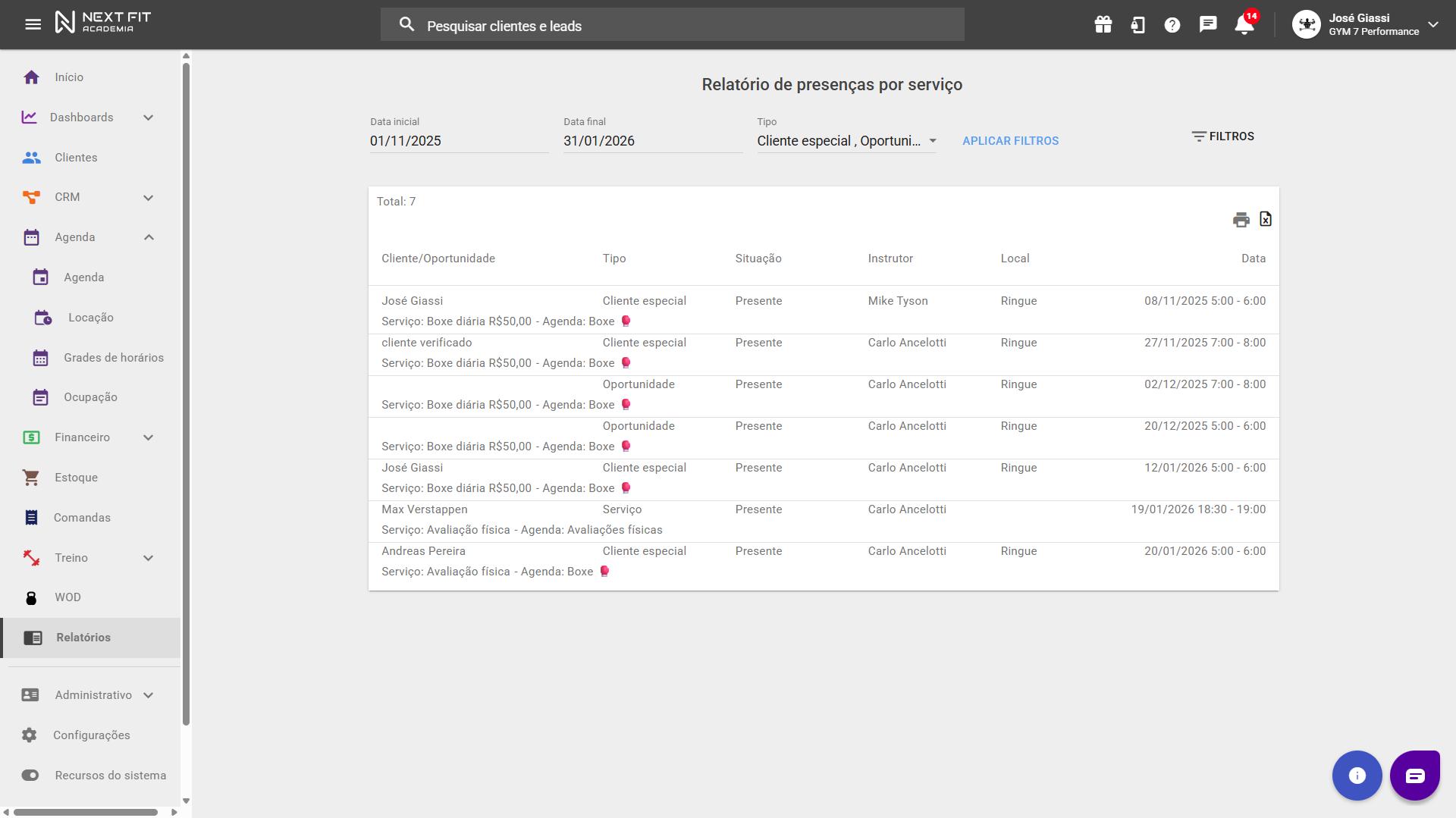 Relatório de Presenças por serviço: O relatório de “Presenças por Serviço” pode lhe ajudar quando você deseja saber como está a presença na agenda de um cliente, de uma oportunidade, ou até mesmo de um cliente especial, em uma grade de serviço. Nele você pode selecionar o período que deseja visualizar, a grade de horário específica, e a situação, se levou presença ou falta, por exemplo.