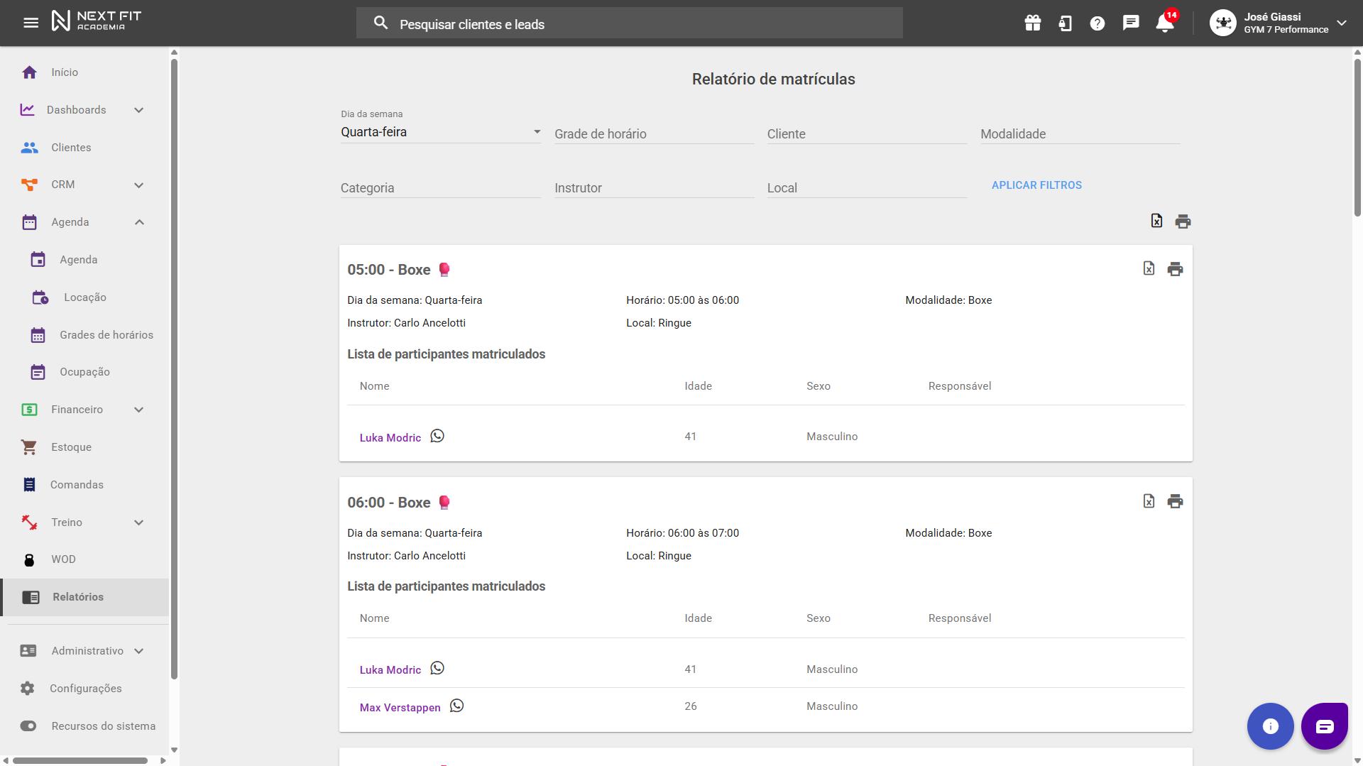 Relatório de Matrículas: O relatório de "Matrículas" tem o foco de mostrar uma visualização completa de suas grades de horários, permitindo a visualização e impressão das informações. Por meio do relatório, é possível acessar informações como os dados da grade de horário, a descrição, data e hora, modalidade, instrutor, dados dos participantes matriculados na grade e outros filtros personalizados.