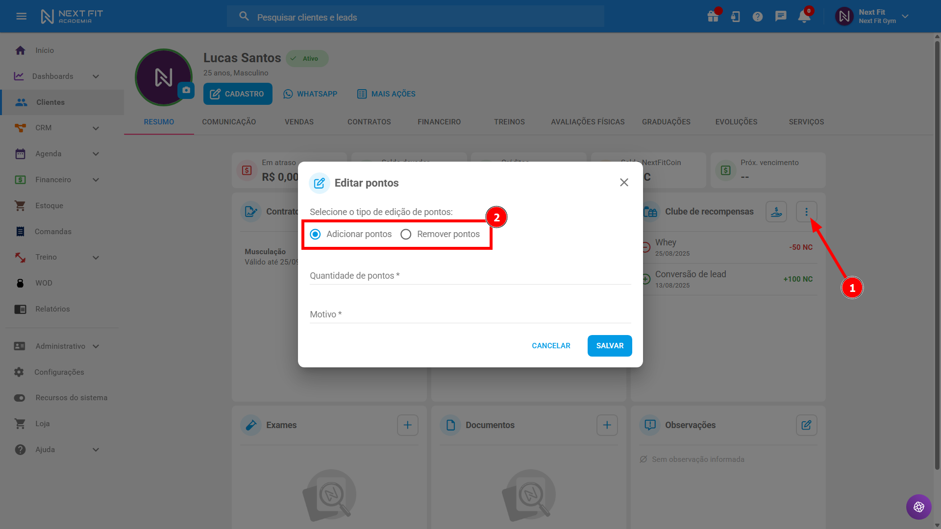 - Treino mensal - Gera pontos quando o cliente conclui determinado número de treinos no aplicativo do aluno em um mês.