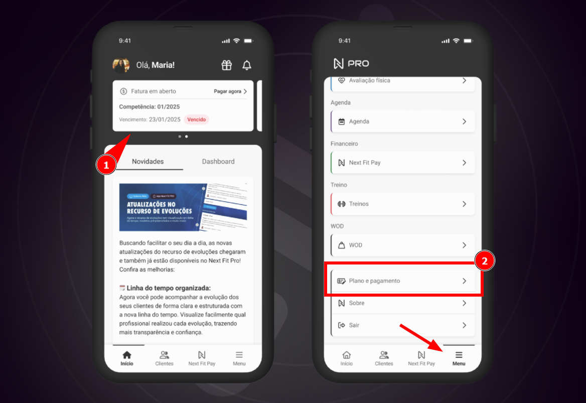 Como acessar e utilizar o Plano e pagamento no app?Para acessar o recurso no aplicativo, na barra inferior do app clique em Menu e, posteriormente, selecione a opção de Plano e pagamento. Para facilitar ainda mais, adicionamos um banner na tela inicial do Next Fit App Pro que redireciona diretamente para a tela de Plano e pagamento.