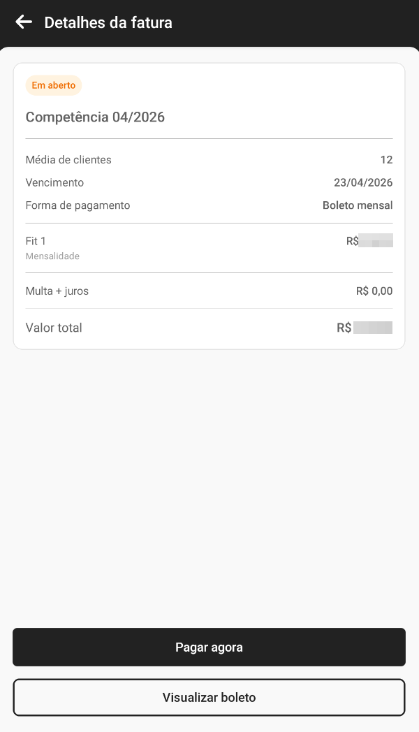 Ao acessar a área de pagamentos, você poderá conferir valores das suas mensalidades de acordo com o FIT (ao clicar no ícone na barra superior da tela), verificar mensalidades atrasadas (em Faturas em aberto) ou já pagas (em Histórico de faturas) e, claro, efetuar novos pagamentos ao selecionar uma das faturas que estão em aberto.